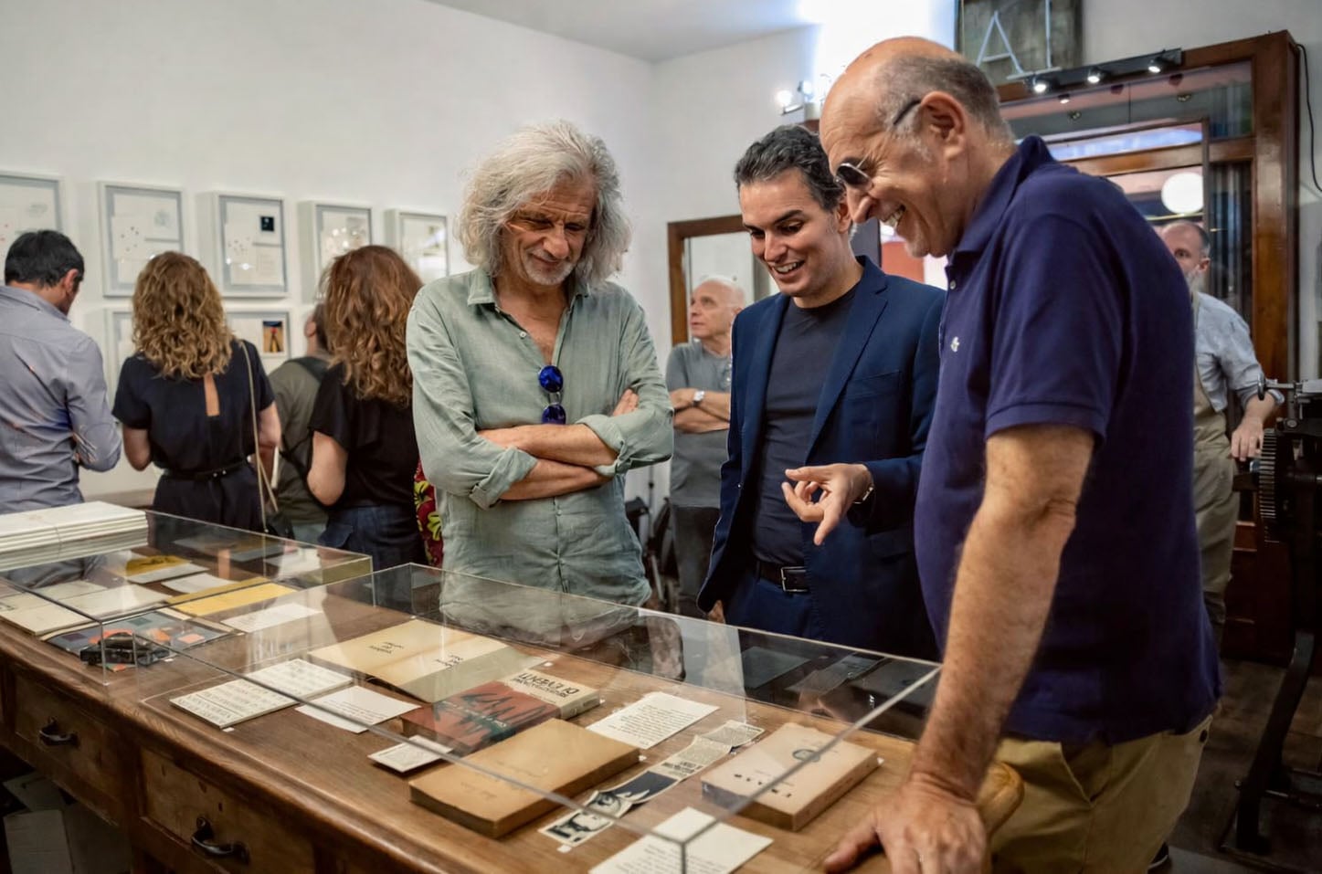 Alessandro Bergonzoni, Matteo Totaro e Mattia Fontanella alla mostra per la mostra “10+1=cento”, allestita da Matteo Totaro in occasione dei cento anni dalla nascita di Roversi (2023).